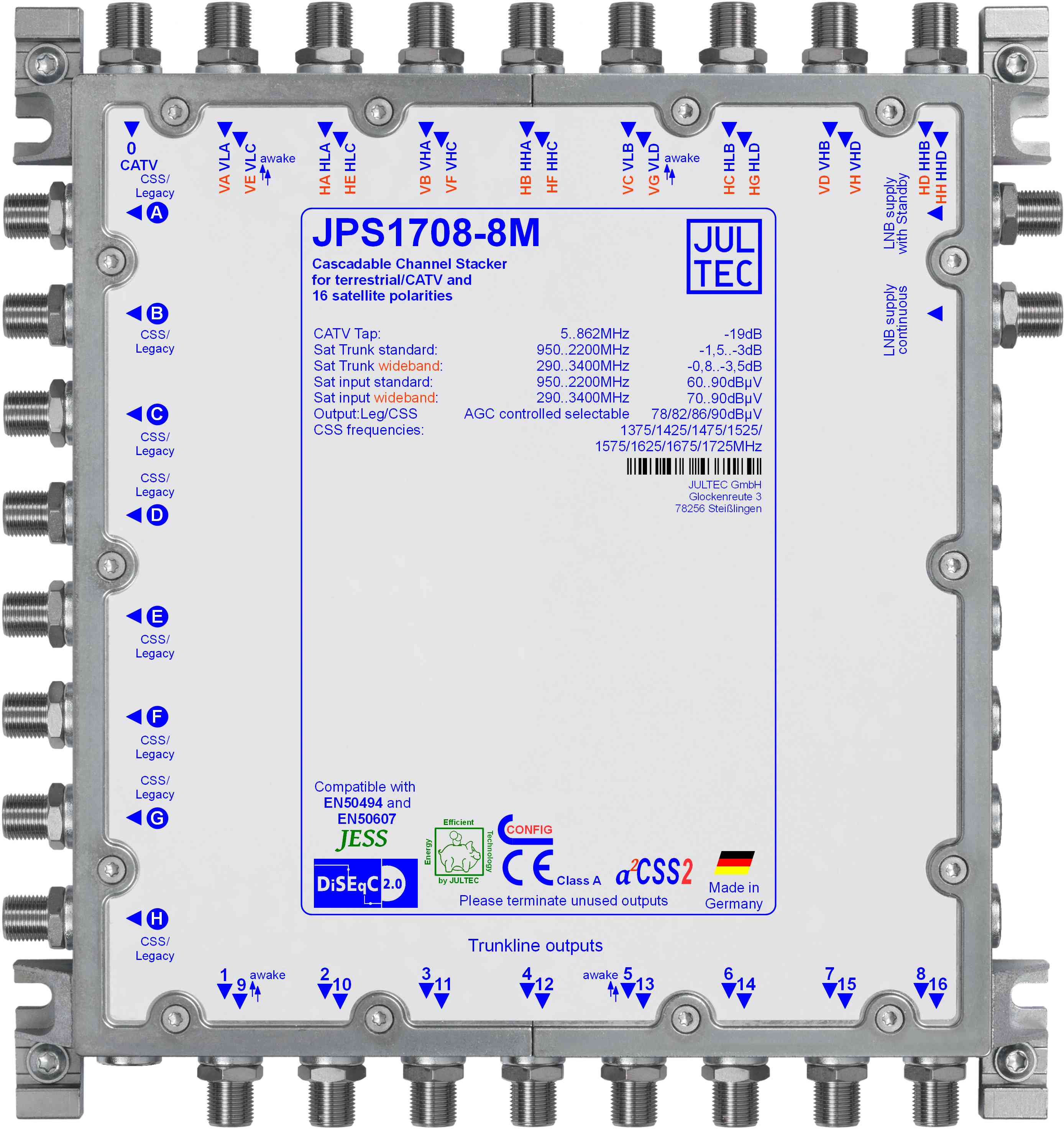 Der Jultec JPS1708-8M ist ein leistungsstarker Einkabel-Multischalter, der für die fortschrittliche Verteilung von Satellitensignalen in privaten und gewerblichen Installationen entwickelt wurde. Er unterstützt den JESS-Standard (Jultec Enhanced Stacking System), der der Norm EN 50607 entspricht, und ermöglicht eine effiziente und flexible Verteilung von Satellitensignalen über nur ein einziges Kabel.