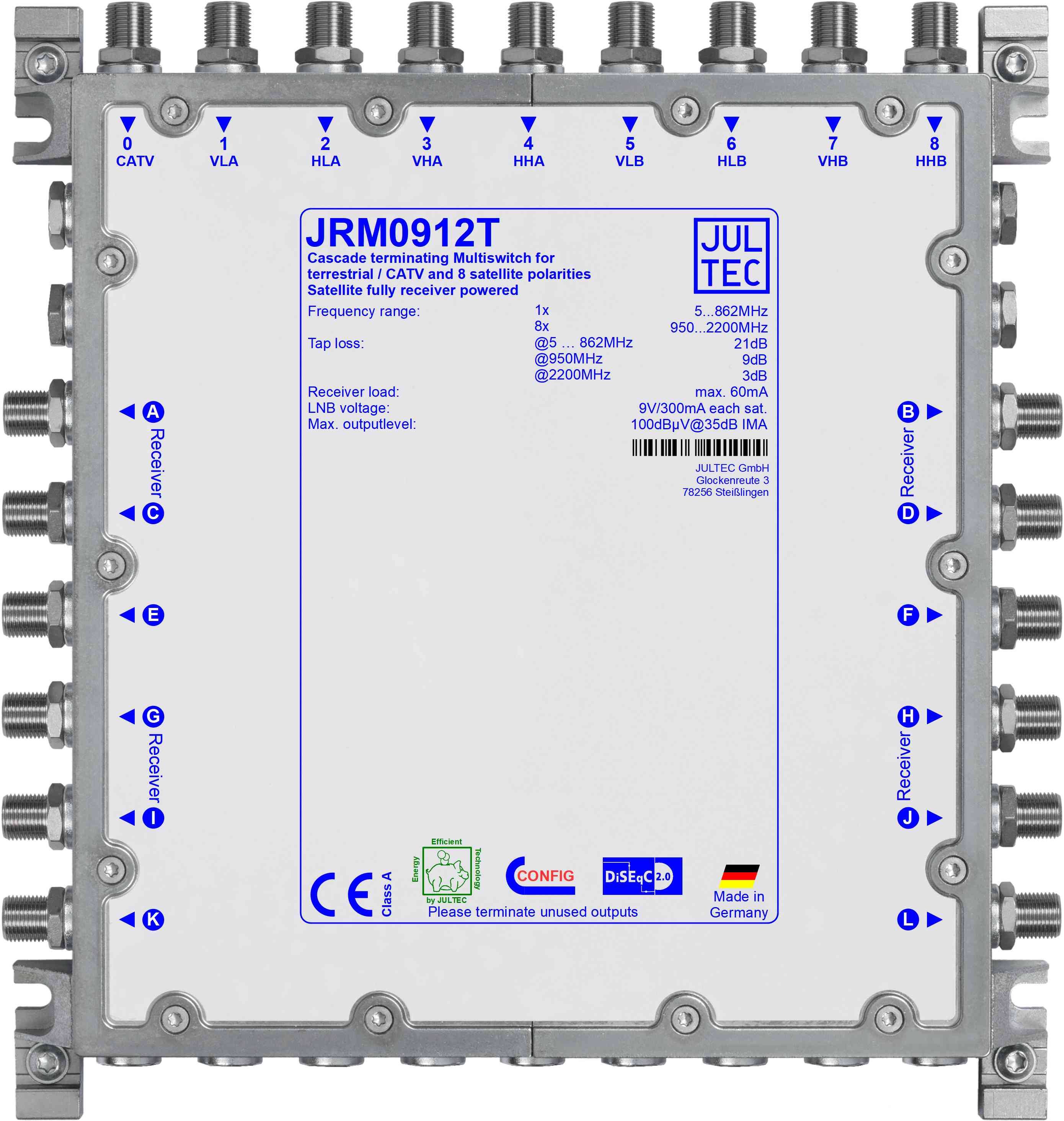 Der Jultec JRM0912T ist ein receivergespeister Multischalter zur Verteilung von Satellitensignalen eines 9-Eingang Ein-Satelliten-Systems auf bis zu 12 Receiver. Er verfügt über eine Terminierungsfunktion und eignet sich ideal als letztes Gerät in einer Multischalter-Kaskade.
